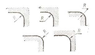 При відсутності додаткових зображень (проекцій) визначальну форму предмета перед розмірним числом наносять знак ((квадрат), якщо сторони елемента деталі плоскі грані. Знак ((діаметр), якщо елемент складається з тіл обертання, знак R (радіус) при округлених кутах (сполученнях).