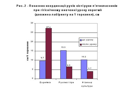 Нами проведено вивчення впливу уроку евритмії на функціональний стан організму третьокласників з використанням ідей "Вальдорфської педагогіки" в сучасній школі № 77. Гігієнічне вивчення було проведене, виходячи із впливу рухів на такі шкільно значущі властивості як розумова працездатність, зосередженість, рухово - координаційні реакції м’язів кісті руки. Вивчали розумову працездатність учнів як інтегральний показник функціонального стану організму учнів, а також координацію рухів м’язів кісті руки як показник функціонального стану рухового апарату дітей. Використовували коректурні таблиці і схему "Лабіринт" як дуже інформативні, зручні, і які охоплюють водночас весь клас в цілому. Дослідження проводили до і після уроку евритмії (експериментальна група (Е)). Для порівняльного аналізу були обрані інші динамічні уроки: контрольні групи складали ті самі учні під час уроку "Рухливі ігри" (К1), а також п’ятикласники загальноосвітньої школи під час уроку фізкультури (К2). Всі ці уроки було проведено в один і той же час навчального дня в середині тижня тривалістю 45 хвилин. Схема уроку евритмії представлена в таблиці 1.(дод. А)