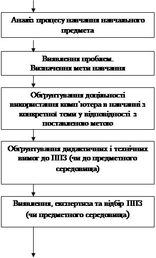 Всі ці проблеми конкретизуються в поетапному процесі, який наочно можна уявити у вигляді схеми алгоритму, який описує технологію підготовки вчителя до проведення уроків з використанням комп’ютера (див. Додаток 1.).