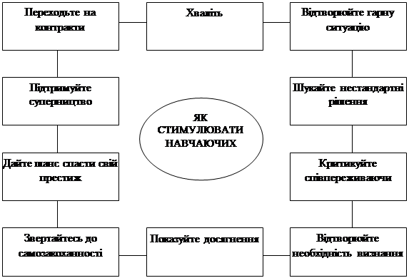 Схвалюйте успіхи. «Образно виражаючись, поплескування по спині за добре виконану роботу це незмінно стимулює учнів продовжувати старанно трудитися», пише американський педагог А. Дреєр. Слова і жести схвалення потрібно адресувати не тільки кращим учням, але і всім тим, хто виявляє старання в учбовій роботі. Відомі випадки, коли розумна і схвальна оцінка з боку вчителя виробляла могутню метаморфозу зіслабовстигаючим учнями.
