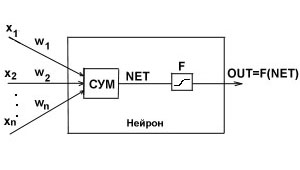 Множество входных сигналов, обозначенных X[1], X[2], X[3],...X[m], поступает на искусственный нейрон. Эти входные сигналы, в совокупности обозначаемые одномерным массивом X, соответствуют сигналам, приходящим в синапсы биологического нейрона. Каждый сигнал умножается на соответствующий вес W[1], W[2], W[3],...W[m], и поступает на суммирующий блок, обозначенный СУМ. Каждый вес соответствует "силе" одной биологической синоптической связи. Множество весов в совокупности обозначается одномерным массивом W. Суммирующий блок, соответствующий телу биологического элемента, складывает взвешенные входы алгебраически, создавая выход, который мы будем называть NET.