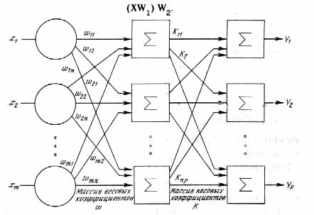 Элементы первого входного слоя не обрабатывают, а только принимают информацию и распространяют ее далее по сети. Значения входов, количество которых равно m обозначим одномерным массивом X. Далее входная информация поступает на внутренний слой. Веса всех нейронов этого слоя формируют двумерный массив W размерностью m*n. Значения выходов внутреннего слоя формируют одномерный массив Z с количеством элементов равным n. Из внутреннего слоя информация поступает на выходной слой. Веса всех нейронов выходного слоя формируют двумерный массив K размерностью n*p. Значения выходов внешнего слоя формируют массив Y с количеством элементов равным p.