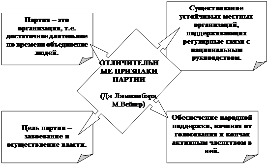 Не всякую группу организованных интересов можно назвать партией. Признаки, отличающие партию от других политических сил, сформулировали современные американские политологи Дж. Лапаломбара и М. Вейнер в работе "Политические партии и политическое развитие". Отличительные признаки партии, согласно данным политологам, представлены схематично в приложении к данной курсовой работе (см. Приложение).