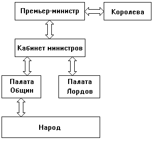 Законодательный орган - двухпалатный парламент (палата общин и палата лордов).Центральная исполнительная власть в Великобритании представлена органом, состоящих из министров,- правительством Ее Величества во главе с премьер-министром. Фактически главную роль в управлении государством играют правительство и премьер министр.