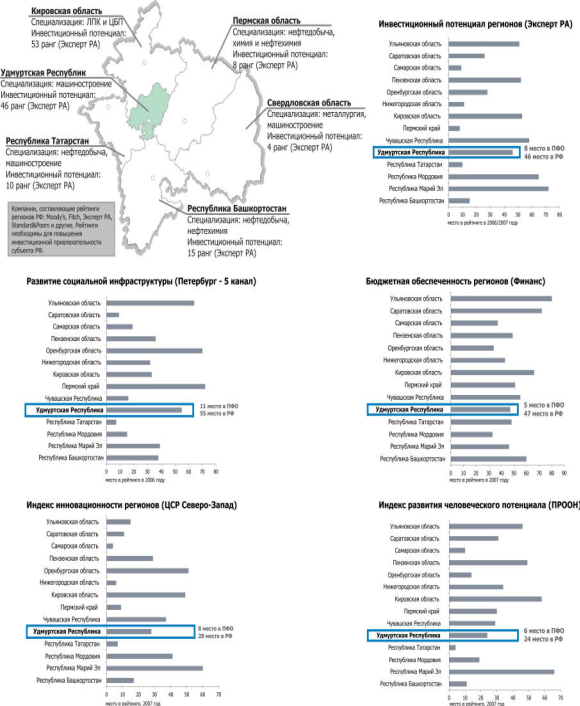 Экономические преимущества и недостатки. Удмуртия — республика с развитой промышленностью и многоотраслевым сельскохозяйственным производством. В то же время Удмуртия характеризуется самой высокой в России концентрацией оборонных предприятий. В республике богатые запасы нефти. В год добывается примерно 8-10 млн тонн[3] . Тем не менее нефтеперерабатывающая промышленность отсутствует. Явно недостаточно представлена в республике легкая индустрия.