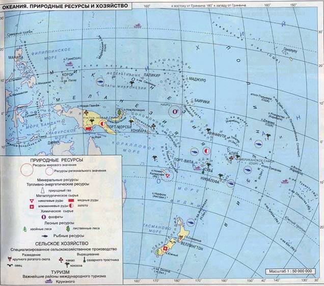 В Океании (Приложение 1) находится несколько сотен островов, многие из которых представляют собой государственные или полугосударственные образования. По данным на конец декабря 1994 г., в ООН были представлены Палау, Федеративные Штаты Микронезии, Фиджи, Маршальские острова, Папуа-Новая Гвинея, Самоа (Западное), Соломоновы острова и Вануату. Другие образования хотя и являются независимыми государствами, но в ООН не представлены (например, Тонга, Кирибати, Науру, Тувалу). Другие продолжают находиться под протекторатом (по ооновскому мандату) США (Американское Самоа и др.), Франции (Французская Полинезия, Новая Каледония), Новой Зеландии (Ниуэ, Острова Кука, Токелау и др.). В этой связи для возникает проблема подсчета экономического потенциала и внешнеэкономической деятельности «стран Океании»[12] . Проблема усугубляется тем, что различные статистические справочники дают различное количество «государств», входящих в Океанию.