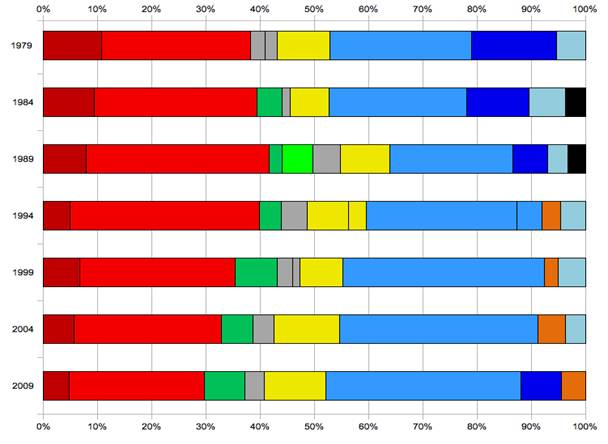Приложение 1 дает обзор евроскептических партий стран-членов ЕС по данным на 1994 год.[15] Перечень этих партий на одном из начальных этапов становления евроскептицизма позволит нам в дальнейшем проследить динамику изменений состава этого списка. Мы увидим, что в количественном составе этих партий вплоть до выборов в Европарламент 2011 года произошли незначительные. Их представительство в национальных парламентах и Европарламенте прослеживается в Приложении 2. В таблице также указаны проценты голосов, которые набрала каждая партия на выборах. Партии, не набравшие больше одного процента голосов, исключаются из рассмотрения.