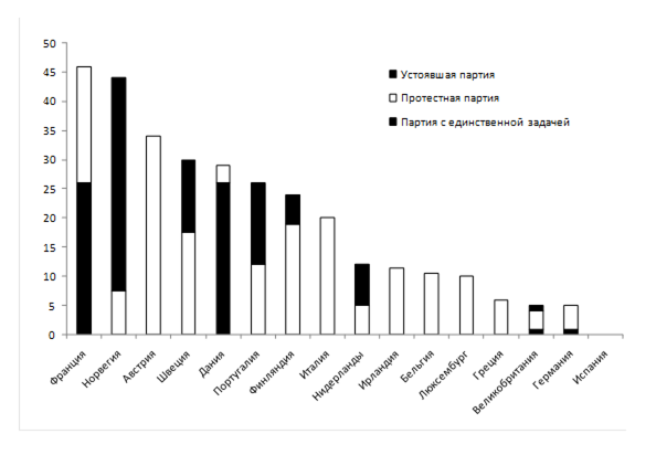 Из приведенных данных видно, что самым распространявшиеся видом оппозиционных ЕС партий являются партии, основанные на протесте (protest-basedparties). Во всех 15 странах кроме Испании есть протестные партии, настроенные против ЕС. Евроскептицизм за время с момента подписания Маастрихтского договора из идеологического придатка отдельных партий превратился в законченную и самодостаточную систему оппозиционного дискурса. Евроскептическая позиция перешла из периферийных к широко представленным партиям ЕС и стала устойчивой платформой для значительной части электората западноевропейских стран.