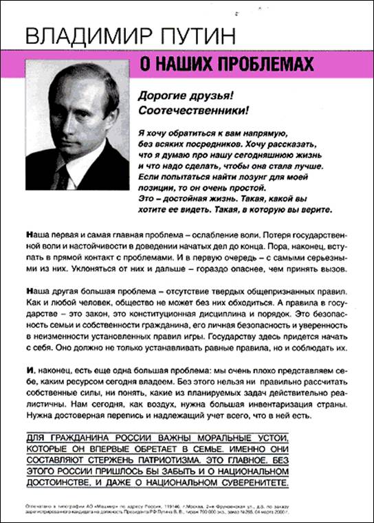 Образец предвыборной листовки кандидата в президенты В. В. Путина (2000г.).