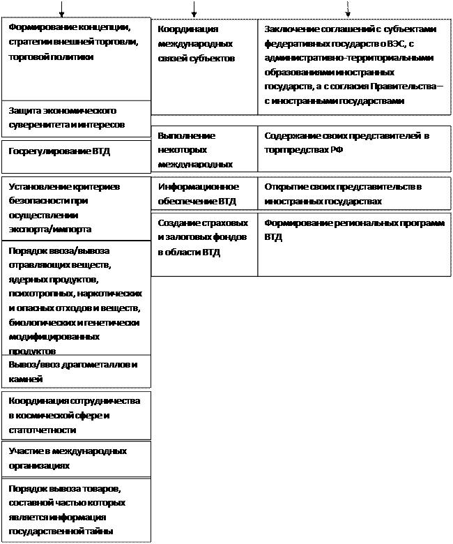 В современных условиях практически базовым правовым актом, регулирующим ВЭП, выступает Федеральный закон от 8 декабря 2003 г. № 164-ФЗ «О государственном регулировании внешнеторговой деятельности». Согласно этому Закону процесс разграничения полномочий можно изобразить следующим образом: