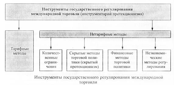 Государства, реализуя внешнюю экономическую политику, могут придерживаться политики свободной торговли, протекционизма или умеренной торговой политики, сочетающей элементы и протекционизма и фритредерства. Основные задачи государства, осуществляющего политику протекционизма, заключаются в следующем: во-первых, помочь экспортерам вывезти как можно больше своей продукции, сделав национальные товары более конкурентными на международном рынке, и, во-вторых, ограничить импорт, сделав иностранные товары менее конкурентоспособными на внутреннем рынке. Поэтому методы государственного регулирования направлены обычно на защиту внутреннего рынка от иностранной конкуренции и на форсирование экспорта. Главные инструменты государственного регулирования международной торговли представлены на рисунке.