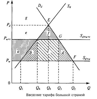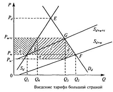 Введение тарифа большой страной приведет к смещению Sd+W вверх до положения Sd+w+r Равновесие будет теперь характеризоваться не точкой F, а точкой G. Объем потребляемой продукции сократиться с Q2 до Q3 , внутреннее производство будет расширяться с Q1 до Q4 , изменятся объемы импорта — с (Q2 - Q1 ) до (Q3 - Q4 ).