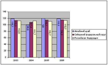 В I полугодии 2010 года в Алтайском крае отмечаются умеренные темпы инфляции – индекс потребительских цен (июнь 2010 года к декабрю 2009 года) составил 103,4%, что ниже на 1,0 п.п., чем в среднем по РФ и на 0,5 п.п. – чем в среднем по СФО. Меньший прирост цен в округе за указанный период характерен только для Новосибирской области (2,5%).