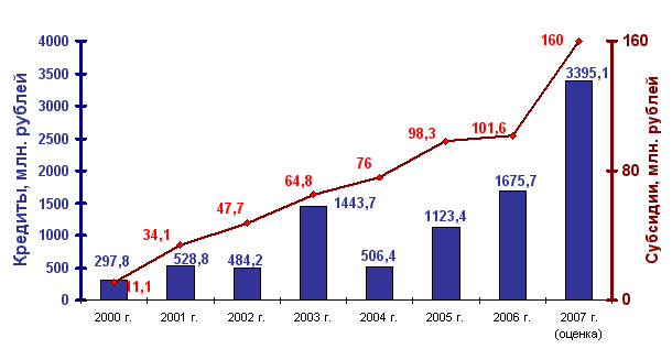 Основой действующей системы государственной поддержки инвесторов стало субсидирование части банковской процентной ставки по кредитам, привлекаемым в кредитных организациях. В течение 8 лет хозяйствующими субъектами края было заявлено о реализации 687 инвестиционных проектов, 412 из которых были поддержаны. За этот период в реальный сектор экономики края привлечено около 9,5 млрд. руб. кредитных ресурсов на условиях субсидирования части банковской процентной ставки; в виде субсидий из краевого бюджета выплачено более 0,5 млрд. руб. (рис. 2). Таким образом, на 1 руб. средств краевого бюджета привлечено в среднем 16 руб. инвестиционных ресурсов. Только в течение 2003-2007 гг. создано 7657 рабочих мест, улучшены условия труда 5420 человек, повышен уровень квалификации 7278 работающих.