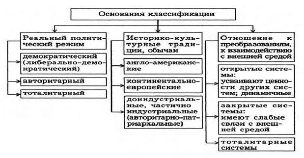 Тип политической системы, формы и методы политической деятельности, пути и цели развития каждой страны существенным образом определяются многообразием форм собственности на средства производства, государственной властью и управлением, а также историческими, национальными, экономическими, социально-классовыми и духовно-идеологическими особенностями развития, степенью зрелости сознания масс.