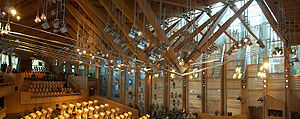 Шотландский парламент насчитывает 129 членов. 73 из которых избираются путем прямого голосования по избирательным округам и 56 — по принципу пропорционального представительства. Парламент избирается на фиксированный четырехлетний срок и выполняет функции, ранее возложенные на Министерство по делам Шотландии. Члены парламента разрабатывают законопроекты по целому ряду вопросов, включая здравоохранение, образование, охрану окружающей среды, местное самоуправление, а также имеют право повышать или понижать ставку подоходного налога на три пенса с фунта. Специально для шотландского парламента в Эдинбурге было построено новое здание.[4]