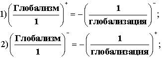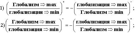 Первое тождество отражает усиление формирования позитивного глобализма. Это тождество отражает известный из математики принцип максимина. Увеличение числителя в левой части тождества приводит к уменьшению знаменателя в правой части монадных весов. При этом, по мере формирования позитивного глобализма процессы позитивной глобализации могут ослабляться и станут минимальными, когда структуры позитивного глобализма будут полностью сформированы и целевая функция глобализации будет отражать, в принципе, только процессы саморегуляции и самосохранения. Тоже самое можно сказать и про второе тождество, отражающее процесс формирования негативного глобализма.