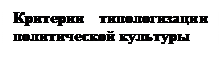 В основании типологии политических культур могут лежать достаточно приземленные факторы, отражающие, к примеру, специфику разнообразных политических систем (X. Экстайн), стран и регионов (Г. Алмонд, С. Верба), типов ориентаций граждан в политической игре (в частности моралистских, индивидуальных или традиционных — Д. Элазар), открытость (дискурсивность) или закрытость (бездискурсивность) политических ценностей к инокультурным контактам (Р. Шварценберг), внутреннюю целостность культурных компонентов (Д. Каванах), идеологические различия (Е. Вятр и др.).