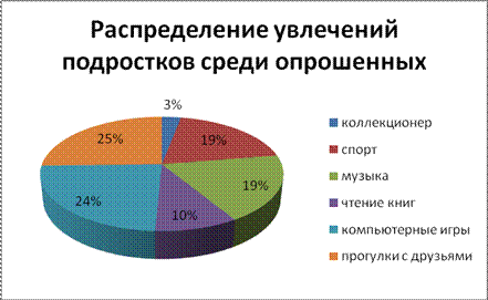 Основная масса респондентов в свое свободное время прогуливается с друзьями (25%). Так же большое количество респондентов увлекаются компьютерными играми (24%), спортом и музыкой (19%). Это еще раз подтверждает о разносторонности развития современных подростков. Хоть и доля коллекционеров и любителей чтения гораздо меньше, чем остальные, но и в современном обществе есть место быть таким увлечениям.