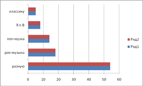 В ходе исследования были выявлены музыкальные предпочтения подростков: в основном подростки слушают музыку разных стилей. Это объясняется тем, что подростки подвластны своему настроению и она не имеют определенной направленности в стилях музыки.