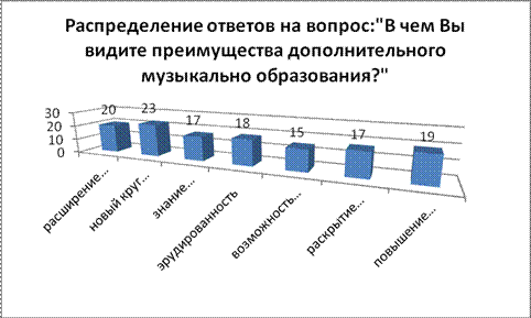 Так же необходимо отметить и полученные результаты о преимуществах дополнительного музыкального образования. Большинство подростков считают, что основными "плюсами" дополнительного музыкального образования являются новый круг общения (23%), расширение кругозора (20%) и повышение самооценки (19%) . Это объясняется тем, что в подростковом возрасте ребенок акцентирует свое внимание не на авторитете родителей, а на авторитете своих друзей и знакомых, на получение новых знаний о различных культурных областях, а также на попытки реализования своих цели и планы.