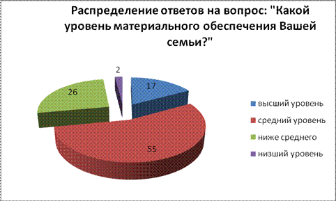 Также отмечен уровень материального обеспечения семьи подростка. Это в основном семьи со средним уровнем материального обеспечения(55%) и уровнем ниже среднего (26%). Следует заметить, что среди опрошенных высший уровень материального обеспечения имеют всего лишь 17% . В современном обществе для хорошего жизненного положения необходимо также иметь и хорошую материальную базу.