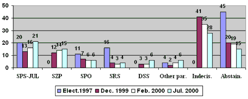 О предпочтениях югославских граждан можно говорить согласно тому же Опросу Центра Политологических и Социологических Исследований Института Социальных Наук. Самым высоким доверием среди политиков пользовался бывший управляющий НБЮ Драгослав Аврамович. На втором месте был лидер Демократической Партии Сербии (ДПС) Воислав Коштуница о котором равное количество респондентов имели отрицательное и положительное мнение. Только 20% ответивших доверяли С. Милошевичу, в то время как 56% не доверяли. 18% доверяли и 52% не доверяли Вуку Драшковичу – лидеру Сербского Движения Обновления (СДО), 13% доверяли и 57% не доверяли лидеру Демократической Партии (ДП) Зорану Джинджичу, 13% доверяли и 64% не доверяли лидеру Сербской Радикальной Партии Воиславу Шешелю[29] . Подобные результаты свидетельствовали о крайнем неудовлетворении общества ситуацией, но как показывает приведённая выше результаты, граждане были не удовлетворены и существовавшей оппозицией и доверие оказывалось только лидерам не запятнавшим себя сотрудничеством с режимом. Другим примером политических предпочтений может служить приведённая ниже таблица №1, где мы можем заметить стабильно невысокий рейтинг правящей партии СПС-ЮЛ и основной оппозиционной группы «Союз за перемены», постепенный рост популярности ДПС Коштуницы и значительное число не определившихся избирателей и голосующих против всех. Таким образом, настроения югославского общества можно было назвать в целом оппозиционными, при сохранявшемся недоверии к «основным» оппозиционным партиям (СДО и ДП), одна из которых в свое время входила в правительство, а вторая бойкотировала выборы в 1997, по слухам, из-за секретной договорённости с властями.