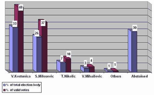 1. Воислав Коштуница – 2.428.714 или 48.22 процентов 2. Слободан Милошевич – 2.026.478 или 40.23 процентов 3. Томислав Николич – 256.876 или 5.10 процентов 4. Воислав Михайлович – 130.598 или 2.59 процента 5. Миролюб Видойкович – 40.765 или 0.80 процентаНедействительных бюллетеней оказалось 3.03 процента."(Источник: Информационный бюллетень № 19. Посольство Союзной Республики Югославии, г. Москва, 27 сентября 2000 г.)