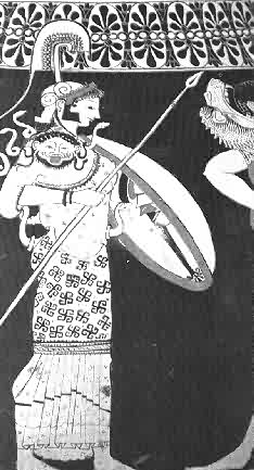 Пример того, как символ свастики использовался в классической Греции. Здесь её можно увидеть как украшение на одежде Афины, богини мудрости, искусства и войны, а также покровительницы Афин. Этот фрагмент взят с греческой вазы, датируемой примерно 500 г. до н.э.