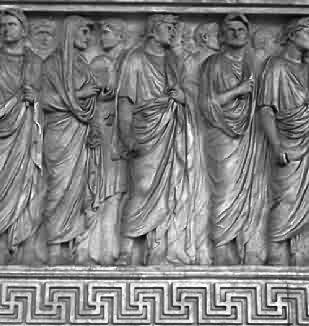 1. Индоевропейское происхождение римлян, в особенности, латинян, кажется очевидным через их повсеместное использование свастики в качестве эмблемы. Здесь свастику можно увидеть на Ara Pacis Augustae, алтаре, построенным в память о мире, установленном Августом, освященным 13 июля 13 г. до н.э. Свастику практически идентичного вида можно найти на многих древнегреческих изображениях, отсюда такая форма свастики называется “греческим ключом”. Это действительно свастика, свидетельство индоевропейских корней античных цивилизаций.