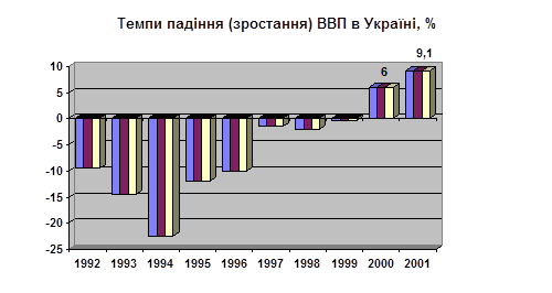 Проте одночасно було немало зроблено і в частині розбудови ринкових структур, приватизації, становлення стабільної державної валюти. Значна частина українських підприємств перейшла на випуск конкурентоспроможної продукції. У 2001 році валовий внутрішній продукт України збільшився у порівнянні 2000 роком на 9%, темп приросту перевищено більш як в 1,5 раза. Збережено досягнуті у 2000 році високі темпи приросту обсягів промислового (14,2% проти 13,2) і сільськогосподарського виробництва (9,9 проти 9,8), здобуто їх прискорення у сфері інвестування в основний капітал (17,2 проти 14,4), обороту роздрібної торгівлі (11,7 проти 6,9), будівельної діяльності (на 10,6 проти 1,6 %).