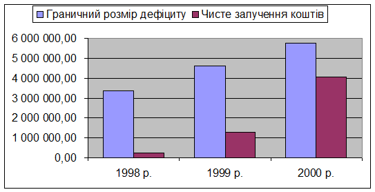 Співвідношення між обсягами дефіциту державного бюджету України та коштів, залучених за рахунок випуску облігацій, зображено на рис. 1.1. На рисунку показники за 1998 — 1999 роки відображають обсяги дефіциту державного бюджету, визначеного законодавством України, а обсяги залучення коштів представлені на рівні фактичного їх надходження до державного бюджету. За 2000 р. ці показники представлені відповідно до обсягів, визначених Законом України «Про державний бюджет на 2000 рік».