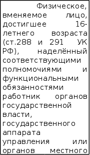 Субъектом получение взятки являются только должностные лица. В части 3 ст.290 УК предусмотрен особый вид должностных лиц- лица, занимающие государственную должность России, государственную должность субъекта Федерации или глава органа местного самоуправления. Субъект дачи взятки общий- физическое вменяемое лицо, достигшее возраста 16 лет. Если должностное лицо заставляет подчинённого передать взятку другому лицу, то взяткодателем будет являться само должностное лицо, а действия подчинённого должны быть квалифицировать по ст.33 и290 УК.