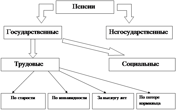 Итак, государственная пенсия – пенсия, выплачиваемая гражданину из государственных фондов социального обеспечения. В соответствии с Законом РСФСР «О государственных пенсиях в РСФСР» от 20 ноября 1990г. № 340-1 устанавливаются два вида государственных пенсий: трудовые и социальные пенсии. В связи с трудовой и иной общественно полезной деятельностью, засчитываемой в общий трудовой стаж, назначаются следующие пенсии: По старости, по инвалидности, по случаю потери кормильца, за выслугу лет. Гражданам, не имеющим по каким - либо причинам права на трудовую пенсию устанавливается социальная пенсия. Такая пенсия может назначаться в соответствующих случаях вместо трудовой пенсии (по желанию обратившегося за ней).