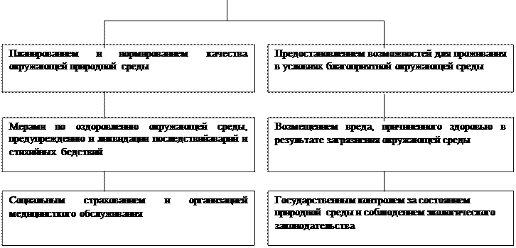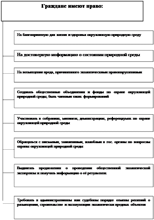 Ранее, до принятия Конституции России 1993 г., в Законе об охране окружающей природной среды было закреплено право граждан на охрану здоровья от неблагоприятного воздействия окружающей природной среды, вызванного хозяйственной или иной деятельностью (ст. 11),(см. схема 3). В соответствии с Законом это право обеспечивается планированием и нормированием качества окружающей природной среды, мерами по предотвращению экологически вредной деятельности и оздоровлению окружающей природной среды, предупреждению и ликвидации последствий аварий, катастроф, стихийных бедствий; социальным и государственным страхованием граждан, образованием государственных и общественных резервных фондов помощи; возмещением в судебном или административном порядке вреда, причиненного здоровью граждан в результате загрязнения окружающей природной среды и иных вредных воздействий на нее, в том числе последствий аварий и катастроф; государственным контролем за состоянием окружающей среды и соблюдением природоохранительного законодательства, привлечением к ответственности лиц, виновных в его нарушении(данные меры являются основными способами реализации экологических прав граждан).