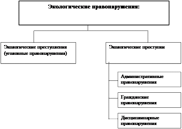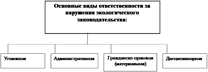 Система ответственности и санкций за противоправное экологически значимое поведение является достаточно сложной. Закон об охране окружающей природной среды перечисляет в разделе ХШ следующие виды ответственности: дисциплинарную, налагаемую в соответствии с уставами, положениями, правилами внутреннего распорядка за нарушения, вытекающие из трудовой функции или должностного положения; материальную ответственность работников перед предприятием в соответствии с трудовым законодательством; административную, уголовную и гражданско-правовую ответственность.