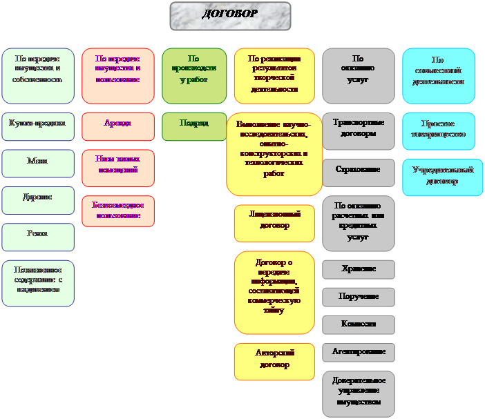 Выражением сущности договора являются выполняемые им функции. Основная функция каждой разновидности договора проявляется в его каузе , т.е. правовой цели конкретного вида договора как средства урегулирования отношений. Поэтому выяснение каузы каждого вида договора – важнейший пункт его анализа. В действующем законодательстве предусматриваются следующие виды договоров: