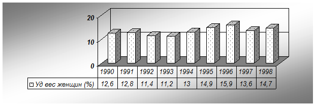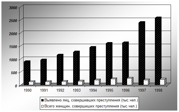 Прежде всего, следует отметить, что женщины традиционно отличаются значительно более низкой криминальной активностью, по сравнению с мужчинами. Удельный вес женщин в структуре преступников невысок и на протяжении последнего десятилетия этот показатель претерпевает незначительные колебания, не превышая, при этом традиционный 11-15%-ный уровень. Однако абсолютные статистические показатели свидетельствуют о наличии тенденции роста женской преступности. Так, за последние пять лет (с 1990г. по 1998г.) число женщин, вовлеченных в криминальные формы поведения, выросла в 1,8 раза[ii]