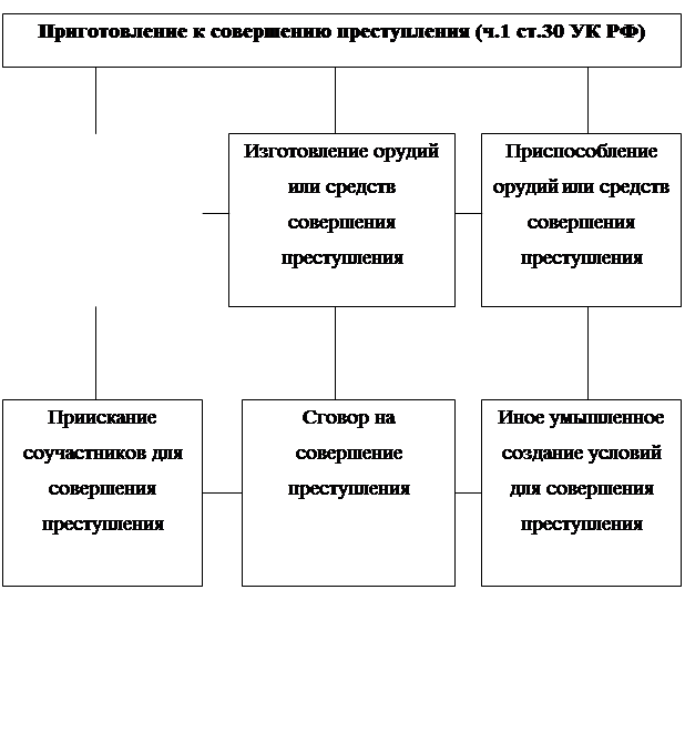 УК РФ 1996 г. (ч.1 ст.30) определяет приготовление к преступлению как приискание, изготовление или приспособление лицом средств орудия совершения преступления. Приискание соучастников преступления, сговор на совершение преступления либо иное создание условий для совершения преступления. Если при этом преступление не было доведено до конца по не зависящим от этого лица обстоятельствам. (Приложение 3)