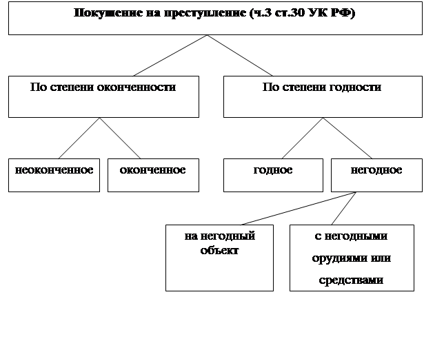 В связи с этим Уголовный кодекс Российской Федерации 1996 года (УК РФ) объявляет преступным и наказуемым не только уже совершенное преступление, но и общественно опасные действия, не доведенные до конца по причинам, не зависящим от воли виновного.
