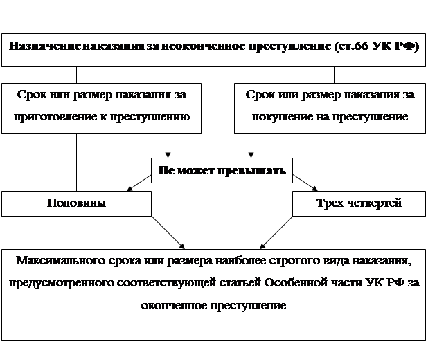 При назначении наказания за неоконченное преступление учитываются обстоятельства, в силу которых преступление не было доведено до конца. Срок или размер наказания за приготовление к преступлению не может превышать половины максимального срока или размера наиболее строгого вида наказания, предусмотренного соответствующей статьей Особенной части Уголовного кодекса за оконченное преступление.[18]