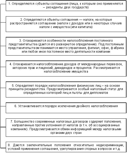 В 1963 году свою модель налогового соглашения об избежании двойного налогообложения предложила Организация экономического сотрудничества и развития (ОЭСР). С тех пор большинство заключаемых налоговых соглашений следует именно этой модели, ввиду чего все они имеют примерно одинаковую структуру, хотя и различаются в деталях, в частности в ставках налогов у источника (рис. 3).