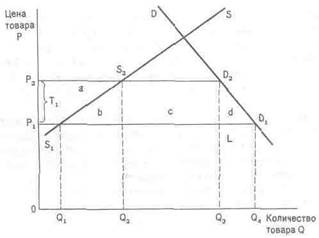 На рис. 1 линия DDi обозначает изменение величины потребления товара в зависимости от изменения цены; линия SSi показывает количество производимых национальной промышленностью товаров, изменяющихся в зависимости от изменения цен.При цене Р1 из общего количества потребляемого товара Q0Q4 на долю местного производителя будет приходиться величина Q0Q1, в то время как на долю иностранного поставщика придется величина Q1Q4.Введем дополнительный импортный налог Т1, повышающий цену товара до уровня Р2. В этом случае общее количество уменьшившегося потребления будет определяться величиной О3Q4; в то же время национальные производители увеличат объем производства на величину Q1Q2; потери для иностранных поставщиков будут равны сумме отрезков Q1Q2 и Q3Q4.Площадь прямоугольника Р1Р2Q0Q4 будет определять величину потерь или дополнительных расходов, понесенных потребителями в связи с общим увеличением цен продаваемых товаров. Эта сумма включает дополнительные прибыли, полученные национальными производителями (четырехугольник «а»), и потери общества, возникающие в связи с тем, что в производство вовлекаются новые, менее эффективные факторы, использование которых стало возможным благодаря протекционистской политике правительства (треугольник «b»). Треугольник «d» показывает потери, возникающие в связи с уходом с рынка части иностранных производителей, а прямоугольник «с» — величину выигрыша лиц, получающих средства, собранные налогами.Большинство современных экономистов исходят из того, что материальные преимущества от следования принципу свободной торговли, несомненно, больше, нежели потери национальной экономики. Протекционизм снижает конкурентное давление на национальных производителей и приводит к уменьшению эффективности производства. Кроме того, если он используется в течение десятилетия (например, в Латинской Америке в 1960—1970 гг.), то он блокирует доступ к новым и новейшим технологиям. Это вредно для рынка, характеризуемого как совершенной (наличие множества производителей и потребителей), так и несовершенной (наличие одной или нескольких монополий) конкуренцией. В условиях монопольного производства производитель получает сверхприбыль. При импорте свободная конкуренция сокращает величину сверхприбыли.В теоретическом плане экономисты классической школы допускают возможность наличия ряда оговорок к идее «свободной торговли». Наиболее распространенной является возможность установления «оптимального» таможенного тарифа. Суть ее сводится к следующему: если страна достаточно велика, то она в состоянии обеспечить снижение цен на импортируемые товары за счет сокращения спроса на них. В этом случае она может ввести таможенный тариф с целью улучшения «условий торговли», т. е. заставить иностранных поставщиков снизить цены. Такая ситуация свойственна для ряда сельскохозяйственных товаров, обладающих низким уровнем эластичности потребления, при этом производство и потребление их сконцентрированы в нескольких местах.Поставщик после введения дополнительного налога (импортной пошлины), опасаясь потерять большой экспортный рынок, может пойти на снижение цены, превышающее величину вводимого налога.Такое явление называется «парадоксом Мецлера», графически его можно представить на рис. 2.