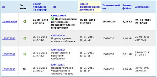 Далее документ перемещается уже по ведомственной сети ФТС. Скорость его перемещения можно оценить по ответам серверов ФТС. У этих ответов в поле «От кого» нарисован зеленый значок таможенника (второе и третье сообщение). Серверы подтверждают прибытие документов следующими сообщениями: