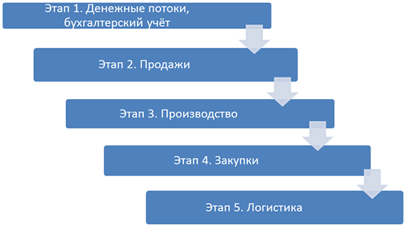 Т.е. при начале деятельности фирмы, всё внимание её руководства, как правило, сосредотачивалось на управлении деньгами, учёте их движения и бухгалтерской отчётности. Затем, начинается этап выстраивания продаж. Начинают формироваться некие подходы к формированию условий продаж, прайсов, скидок, бонусов а также анализа результата продаж. Далее, дистрибьютеры начинают задумываться над вопросами организации производства на контрактной основе. Возникают вопросы учёта затрат на комплектующие и расходные материалы в конечной себестоимости продукции. Затем, начинается этап учёта затрат на пути от Поставщика до основного склада (Закупки). На этом этапе также немало вопросов. Особенно если номенклатура превышает 400 наименований а количество поставщиков – более 10. Отработка решений на каждом из этих этапов нередко длится не один год. И наконец, наступает очередь управления издержками в целом по всей логистической цепочке фирмы. И вот тут-то обнаруживается, что нужно пересматривать все предыдущие 4 этапа заново, поскольку логистика пронизывает своими процессами весь бизнес компании…