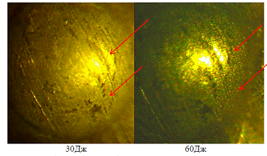 Рис 3. Увеличенное изображение следа бойка на гильзах 30Дж и 60дж.
