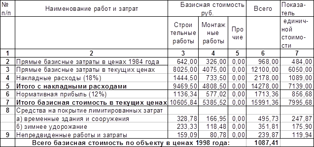 Смета рассчитывается по СНиП IV-83 «Правила разработки и применения прейскуранта на строительство зданий и сооружений» При составлении сметной документации могут применяться различные методы: базисно- индексный, базисно- компенсационный, ресурсный, на основе банка данных об аналогичных объектах. Выбор метода зависит от условий контракта и общей экономической ситуации на рынке. В данной работе применен базисно- индексный метод расчета, в котором используется система текущих и прогнозных индексов цен по отношению к стоимости, определенной в базисном уровне или в текущем уровне предшествующего года.