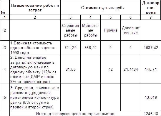 Таблица 3. Таблица 3- ведомость договорной цены на строительство павильонов ожидания общественного транспорта, где средства ,связанные с риском и изменением коньюктуры рынка принимаются в размере 1,2 % от суммы базисной стоимости и дополнительных затрат.