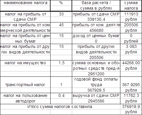 Налог на имущество составил 1.5% от суммы оборотных и основных средств (2951200 рублей) и равен 44268 рублей.