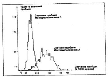 Проблему неопределенности будущего развития можно решать и посредством компьютерной имитации «принципа Монте-Карло». Каждый компонент затрат и результатов получает прежде всего считающийся вероятным стоимостный диапазон оценок, например, зарплата при расположении на участке А — от 850 до 1300 ус. ед.; при этом дополнительно возможно еще выделение наиболее вероятных значений, например, зарплата для участка А — 1000 ус. ед. Компьютер «выбирает» для каждого компонента затрат и результатов из соответственно заданного интервала «распределения вероятностей» соответствующее стоимостное значение и рассчитывает, исходя из этого, прибыль в зависимости от места расположения предприятия. Этот процесс многократно повторяется для каждого участка со все новыми «случайными значениями» компонентов затрат и результатов. В конце для всех участкоа получаются вероятностные распределения прибыли, зависящей от места расположения предприятия. На схеме 2.1 дан пример этого: участок А с почти 300000 ус. ед. прибыли показывает явную более высокую ценность по показателю ожидаемой прибыли, чем участок Б с едва ли 150000 ус. ед. прибыли. Однако разброс значений прибыли на участке А при этом значительно шире, а посему, правда с небольшой вероятностью, на участке Б можно получить прибыль большую, чем на участке А.